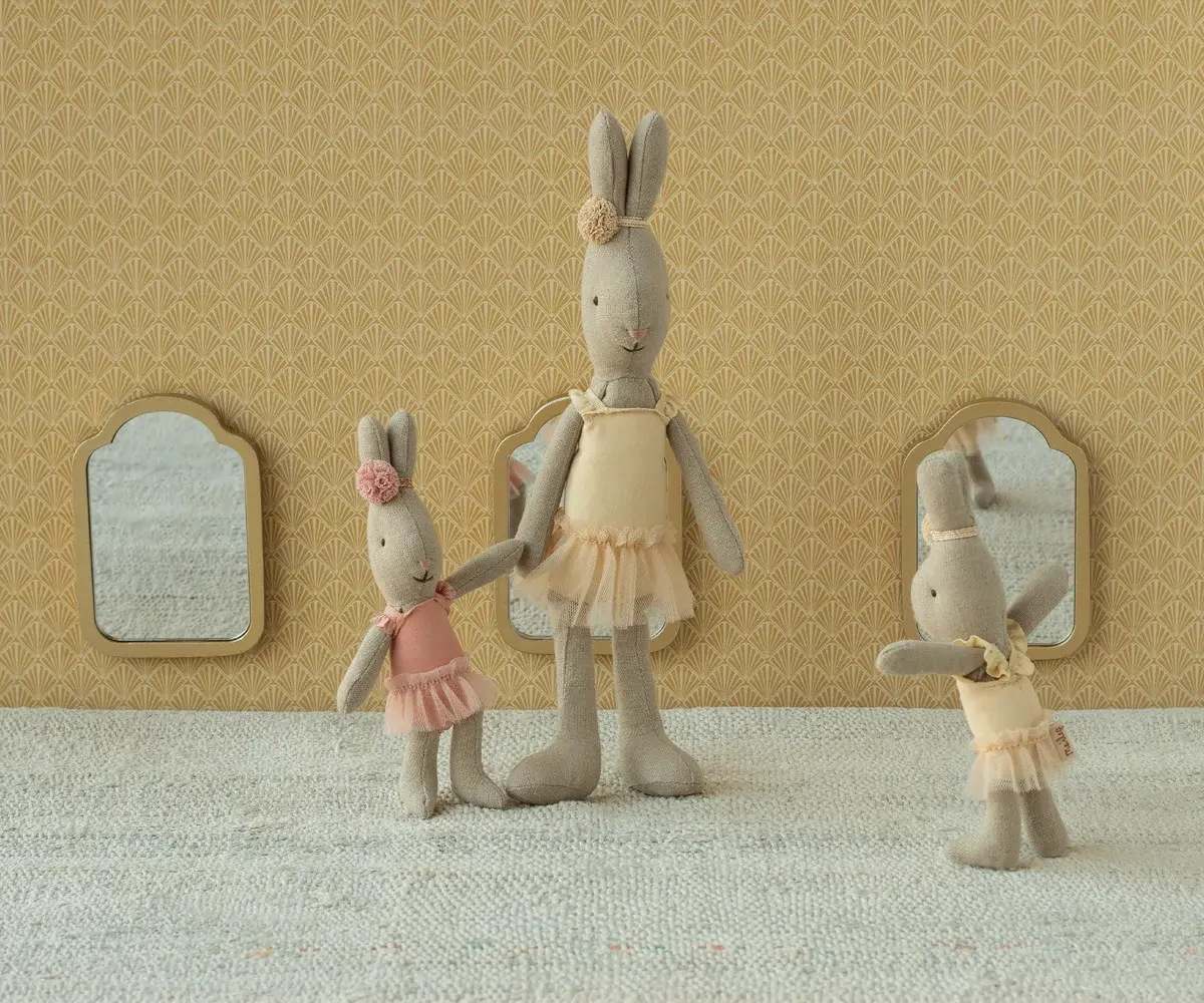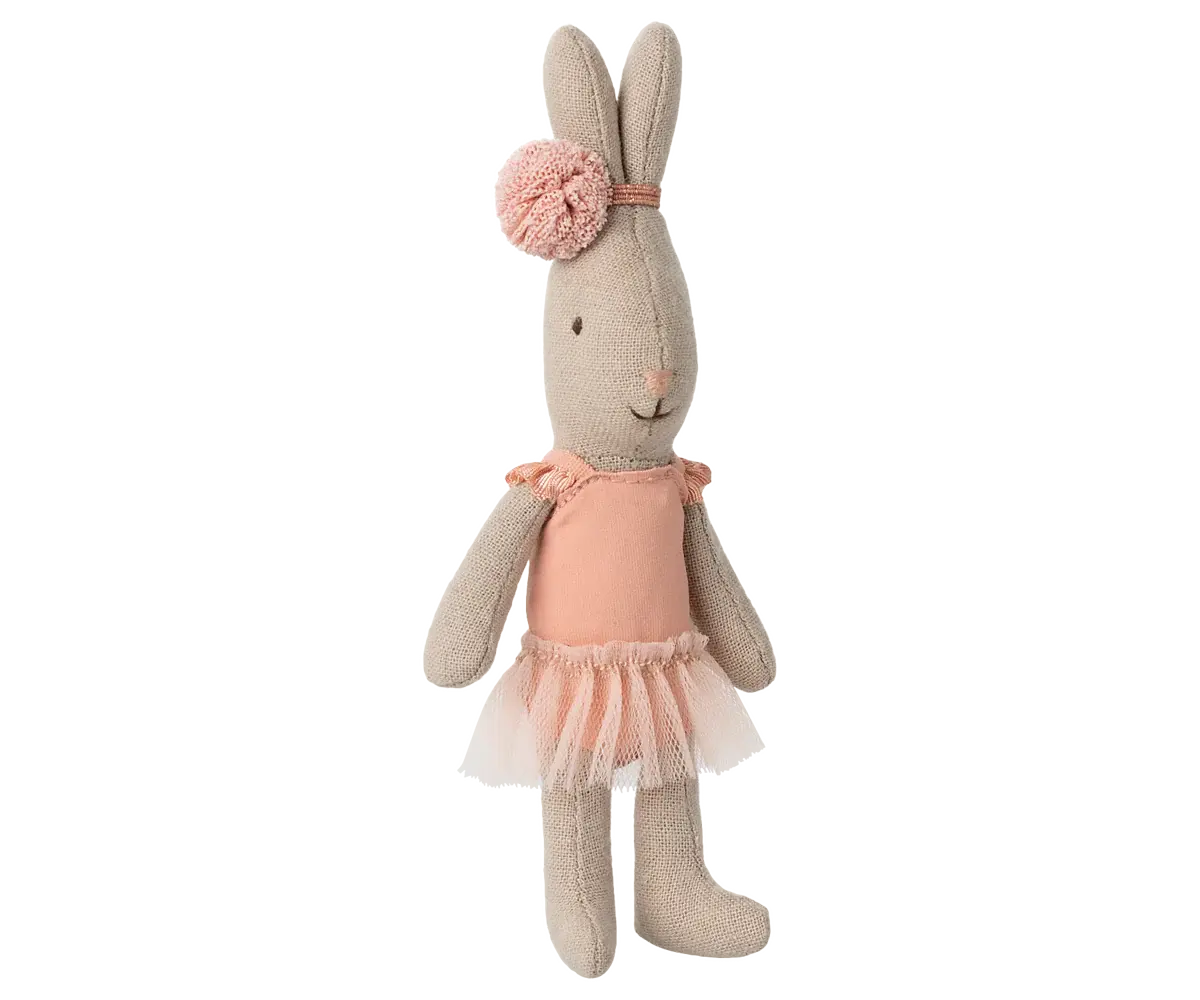 Het bekende Maileg-microkonijntje verkleed als balletdanseres. Het draagt een pakje en een tule rok en heeft een kleine versiering rond de puntige oren.